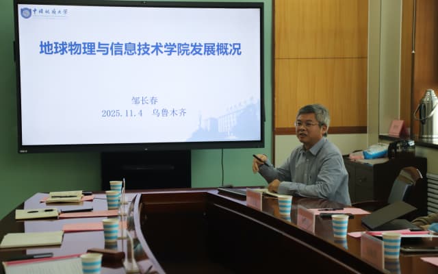 优秀校友、物化探中心党委副书记、主任屈栓柱向母校领导汇报了物化探中心的发展现状与科研成果。他指出,在落实国家找矿突破战略行动中,新疆潜力巨大、资源丰富。物化探中心物探应用场景全面、示范点众多、科研项目丰富,目前对高素质人才需求迫切。屈栓柱表示,中心始终秉持引进人才的诚意、深化合作的决心以及服务国家地质事业的初心,期待与母校在就业引导、人才培养、科研合作等多个层面进一步加强合作。