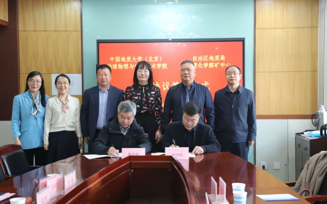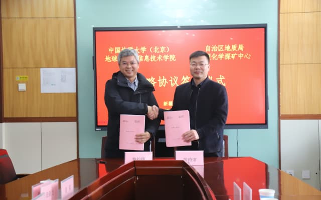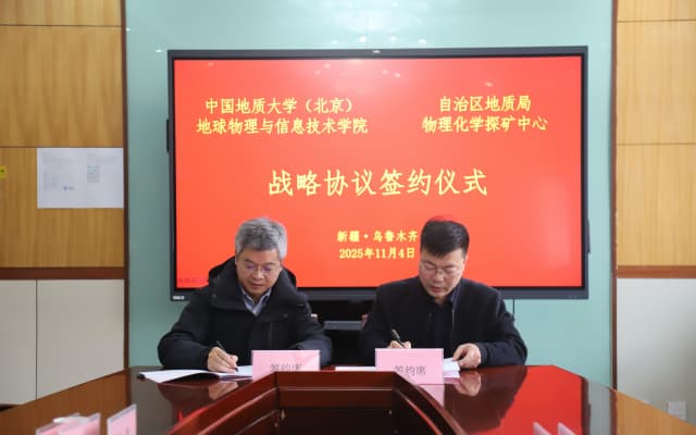2025年11月4日,地球物理与信息技术学院与新疆维吾尔自治区地质局地球物理化学探矿中心正式签署合作协议。地信学院领导班子,新疆维吾尔自治区地质局地球物理化学探矿中心党委书记黄志荣,党委副书记、主任屈栓柱等共同出席签约仪式。签约仪式由地球物理化学探矿中心党委书记黄志荣主持。