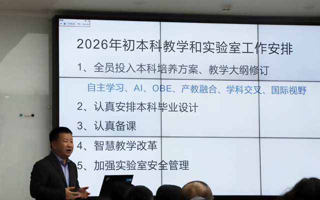 钱荣毅副院长回顾了2025年度本科教学与实验室工作,并部署了2026年初的重点任务。他指出,过去一年学院成功完成了四个专业的招生、教学培养、以及教育部本科教学评估和工程教育认证等工作,与多所国外大学建立了合作培养机制,与多家地勘单位及产业方共建实践教学基地,并新建了地震学实验室。他强调,全体教职工应积极参与本科培养方案和教学大纲的修订工作,重点围绕学生自主学习、人工智能应用、成果导向教育、产教融合、学科交叉及国际化视野等方面进行深化。同时要求认真组织本科毕业设计,持续推进智慧教学改革,最后重点强调要将实验室安全管理工作放在突出重要位置。