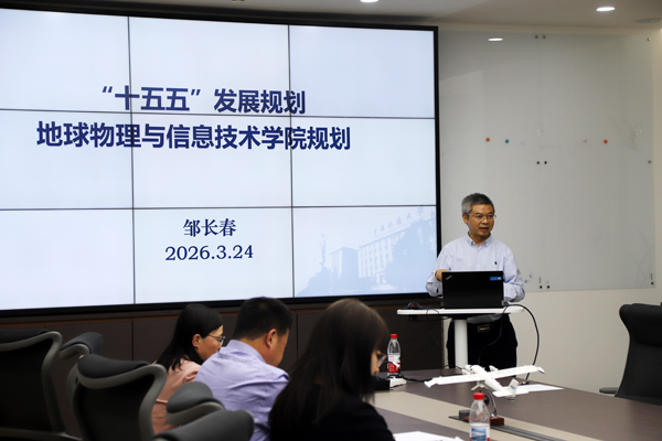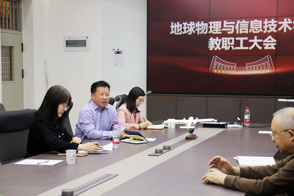 3月24日下午,地球物理与信息技术学院在教五楼227召开2026春季全体教职工大会,会议由学院党委书记吴海英主持。